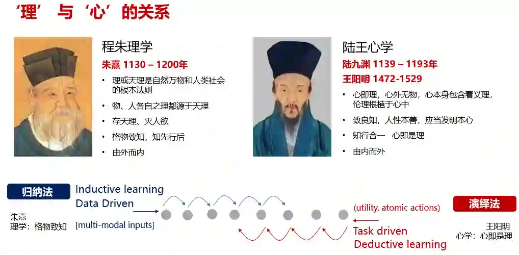 程朱理学, 注重“天理”,这包含我们今天所看到的物质世界的“物理”,对应于人类的直觉、朴素的物理模型 (Intuitive physics),和人文社会的“伦理”与社会规范 (ethics and social norm),后者对应于人工智能的行为决策函数所产生的行为模式。