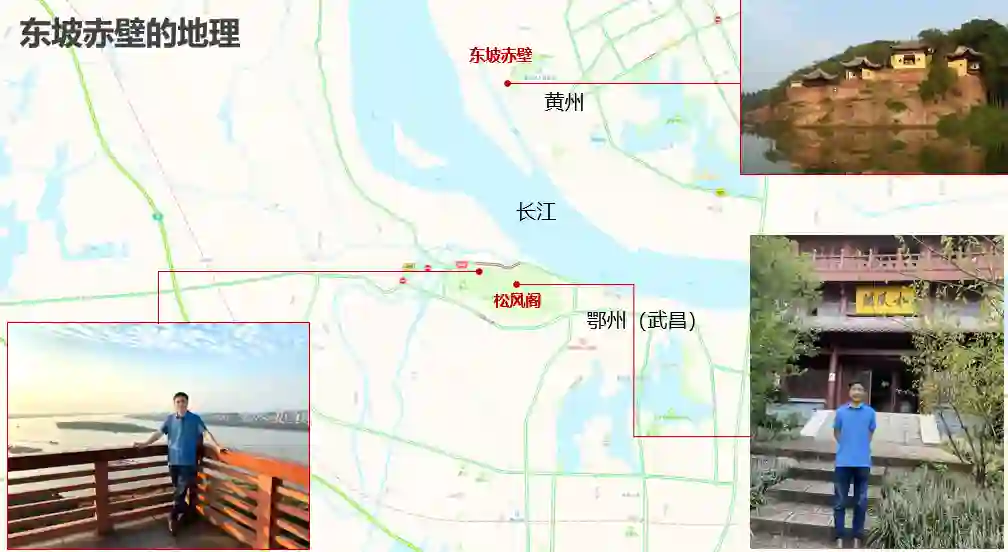 回到苏轼和他的《赤壁赋》。和大多数人一样,我第一次读到《念奴娇·赤壁怀古》,是在高中的语文课本里。当时对这首词的理解,仅仅停留在读词的内容和豪放派的文风。老师说,苏轼应该知道赤壁之战并不是发生在黄州,现在这里直接就叫“东坡赤壁”了。见图右上角的确有一个赤色的岩面,后来长江改道,不从这里经过,变成了一个湖汊子。
