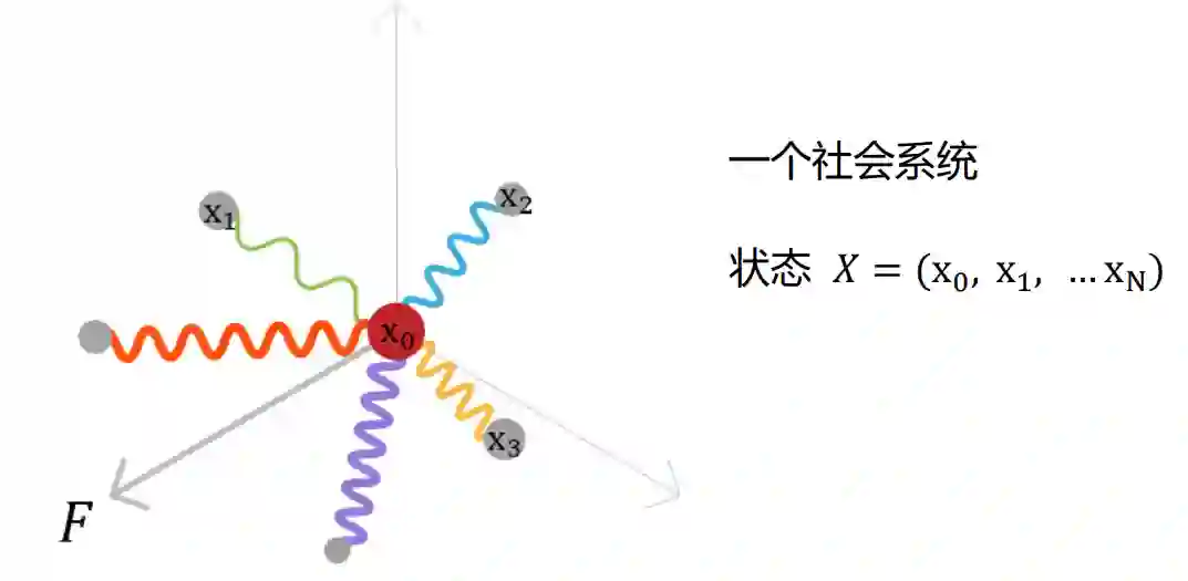 马克思说“在其现实性上,人的本质是一切社会关系的总和”。这是一个非常透彻的论断。就个体而言,每一对关系 都可以由一个势能函数 表示,代表了某种社会规范,如配偶、君臣、师生等。每个U都可以看作是一个“弹簧”, 代表一种约束与相互作用。某个维度上“弹簧”的作用,是在该维度上保持一种动态的平衡:如果二者距离过小,会导致推力(合力)凸显;如果距离过大,会导致拉力(合力)凸显。这里我们只说二元关系,多元和高阶的关系也可以有函数表达。