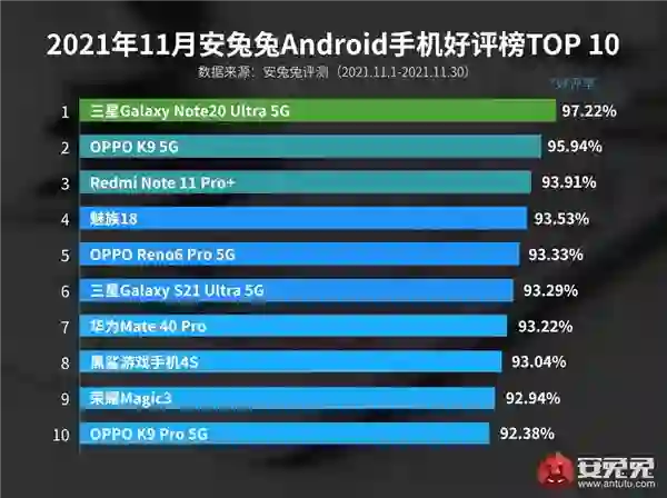 安兔兔近日公布了 11 月 Android 手机好评榜,排名第一的仍然是三星 Galaxy Note20 Ultra,OPPO K9 5G 排名第二,Redmi Note 11 Pro+ 拿下第三。除了以上机型,魅族 18、OPPO Reno6 Pro 5G、三星 Galaxy S21 Ultra 5G、华为 Mate 40 Pro、黑鲨游戏手机 4S、荣耀 Magic3、OPPO K9 Pro 5G 等机型也进入了本次好评榜前十。