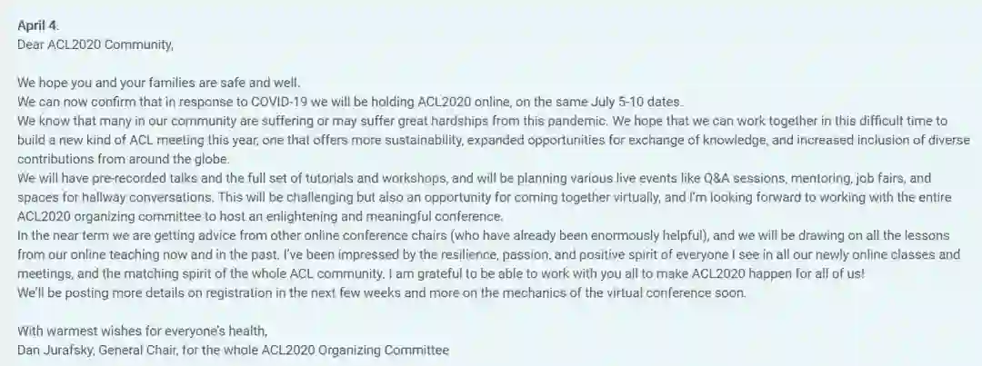 值得一提的是,为了应对新冠肺炎的影响,大会主席Dan Jurafsky发信确认,ACL2020将在线举办。