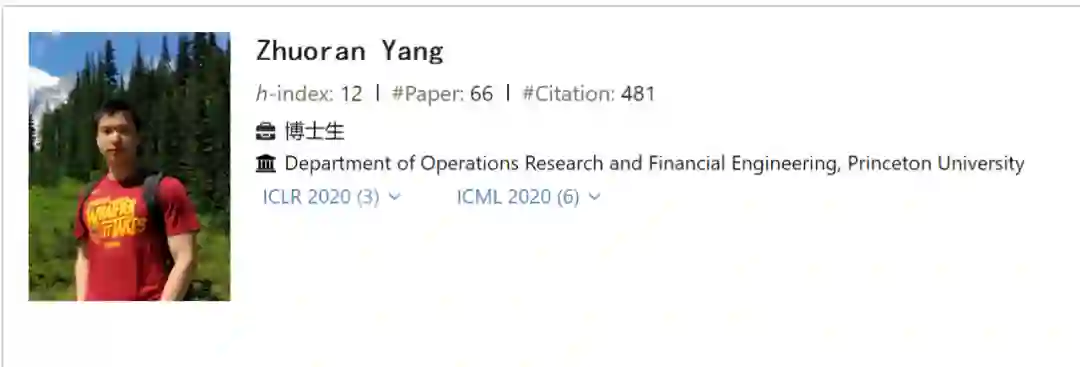 Zhuoran Yang(杨卓然)以 6 篇文章入选与 Chi Jin(金驰)并列位于华人贡献榜第 3。