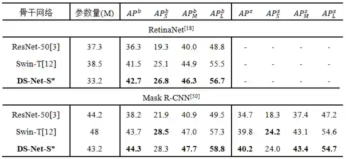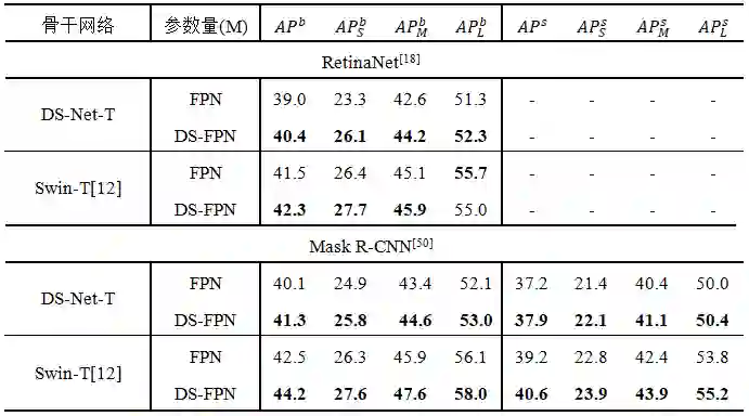 对于下游的检测和分割任务,DS-Net将双分辨率机制引入FPN,建立DS-FPN,以此引入更加丰富的局部和全局信息,实验证明DS-FPN可以有效提高检测器的性能