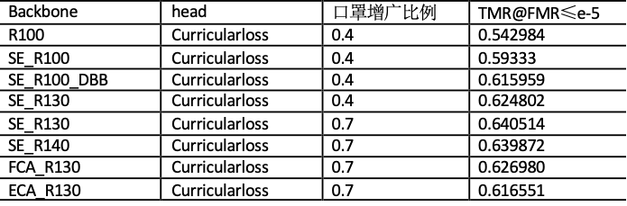 由于比赛有前向推理时间的的限制,需要在规定的推理时间内,构造一种对口罩人脸识别有效的模型。团队从模型的深度、注意力、重参数三方面进行分析,并设计了一种主干网络。其中模型的深度和重参数,可以提取丰富的人脸特征。注意力可以让提取到的特征集中在人脸的非口罩区域。主要的消融实验如下表所示。