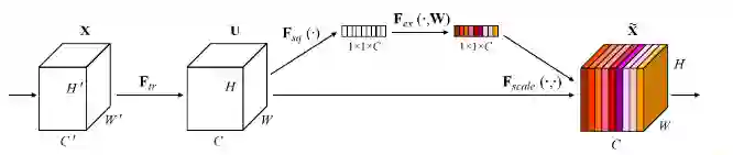 从前两行可以看出,SE注意力结构对模型效果的提升很明显。另外团队还尝试了不同的注意力模型,如FCA、ECA,针对本次比赛的测试集,效果相对SE都有所下降,但是要比不加注意力的效果好。说明在模型中加入注意力网络,能提到更有效的口罩人脸特征。SE注意力的结构如下图所示。