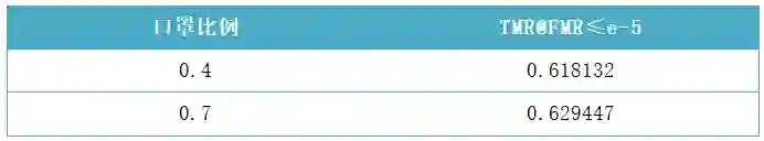 考虑到现有的一些生成口罩数据的方法,需要做3D人脸对齐(3DDFA)及人脸关键点检测。这种方法速度慢,影响训练速度,并且口罩类型有限,影响泛化效果。为了解决这些问题,团队采用了更简单有效的随机cutout的在线数据生成方法。这种在线数据生成方式具有速度快、口罩大小随机等特点,模拟了丰富的口罩样本。口罩增广的具体参数是:mask中心点选在(56,112),mask的宽高在[56,112]内随机采样,输入图片保持为112x112,从效果上可以看出,最大的模拟口罩会达到人脸的一半,而最小的模拟口罩只会遮住嘴部区域,如下图所示。另外团队还尝试了不同的口罩数量比例,从消融实验可以看出,增加口罩样本的比例,对测试集的效果有一定的提升。
