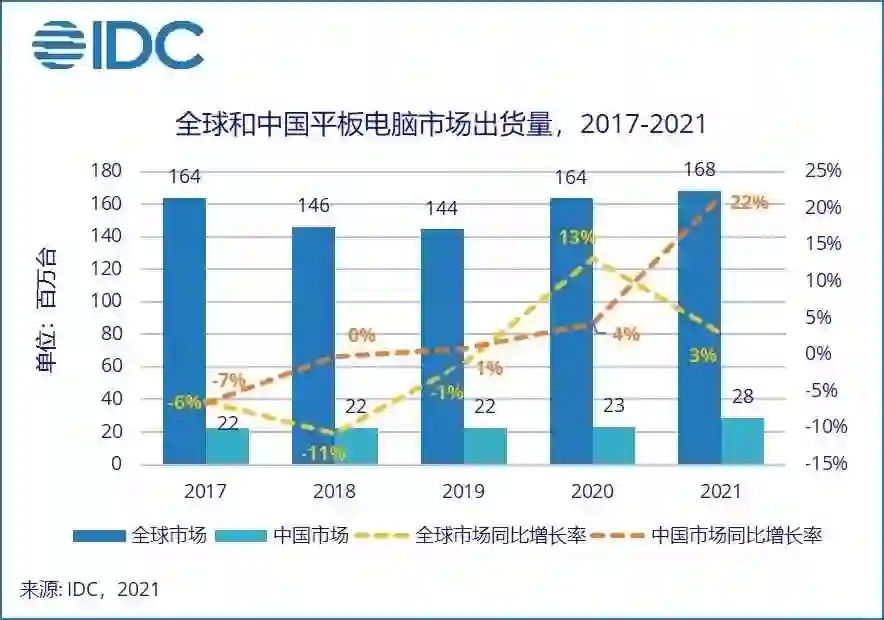 据市场研究公司IDC数据显示,2021年全年中国平板电脑市场出货量约2846万台,同比增长21.8%,创近7年出货最高增幅。由于需求放缓,全球平板电脑2021年第四季度的出货量同比下降11.9%,达到4554万台。而2021年全年,全球平板电脑总出货量同比增长2.9%,达到1.68亿台,是2016年以来的最高水平。