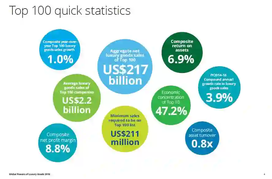 全球排名前100强的奢侈品公司总销售额达2165.79亿美元;