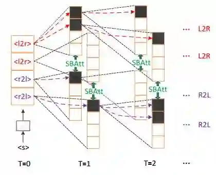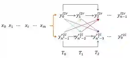 我们的想法可以由图 10 简要说明:自然语言文本生成模型保持从左往右和从右往左的同步解码,但是在每个时刻两个方向的解码都进行充分的交互。预测 时不仅可以利用历史预测结果