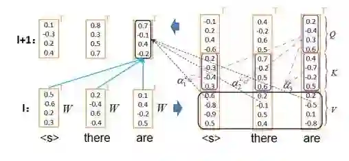 图 4 与图 5 分别展示了 Transformer 编码器和解码器中自我注意机制的计算方法:首先将词向量转化为具有相同维度的查询 Q、键 K 和值 V,然后用 Q 与 K 计算相关性,最后用相关性对 V 加权获得某个位置更深一层的语义表示。两张图的核心区别体现在图 4 编码器中每个位置的上层语义表示学习都可以利用上文和下文信息,而图 5 解码器中每个位置的上层语义表示学习只能利用已经产生的历史信息。
