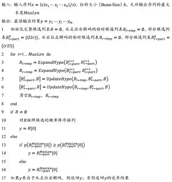 图 12 给出了同步双向推断模型的柱搜索解码算法示意图。以柱大小 b=4 为例,每一时刻 L2R 和 R2L 方向利用同步双向注意机制 SBAtt 进行同步解码,并分别保留 b/2 个最优候选。如果当前时刻预测结果为结束符〈/s〉,则将该候选放入完整候选列表。当完整候选列表达到 b 的规模,则停止解码,输出列表中概率最大的候选作为最终输出。如果最终结果来自于 R2L 方向,则需要在输出前对结果进行逆序操作。详细算法流程见算法 1。