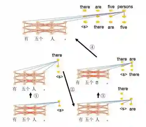 图 3 显示的解码模块中,第一个输出单词为开始符,与编码器中每个位置的语义表示进行注意机制计算并加权得到第二层语义信息,① 采用相同的方式可以获得更多层的语义信息,最后利用 softmax 函数预测下一个时刻的输出“there”;② 预测下一个输出单词时,首先需要进行输出端的注意机制计算过程,然后再与编码器的语义表示进行注意机制计算;③ 进行相同的操作获得多层语音信息,再由 softmax 函数给出下一个时刻应该输出的单词“are”;④ 重复 ② 和 ③ 最终生成整个文本序列(一般直到产生结束符“</s>”,停止解码过程)。