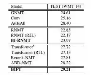 BIFT 是我们近一年来的研究工作成果,在 2018 年 10 月份 BERT 诞生时,我们其中的一项工作(Synchronous Bidirectional Neural Machine Translation)已经被 Transactions on ACL 条件接收。BERT 非常伟大,在十多个自然语言理解任务中刷到最高分。相比而言,我们当时的工作只是在机器翻译任务上做出了卓有成效的尝试,所以肯定无法与 BERT 相提并论,只是联系在一起更容易描述和让大家理解。BIFT 目前在机器翻译和自动摘要两个自然语言生成任务(尤其是机器翻译任务)中取得了显著效果,我们希望 BIFT 在其他自然语言生成任务中也能大放异彩。