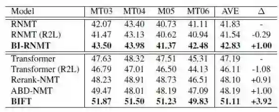 从表 1 可以看出,无论采用循环神经网络还是 Transformer,同步双向推断模型都能够显著提升译文质量。特别是在 Transformer 框架下,BIFT 模型展示了令人惊喜的提升空间。