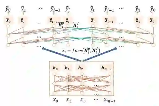 已知,可见是矛盾的,所以预测某个时刻的输出时无法同时利用全部的历史和未来信息。我们的想法是最大限度地挖掘和利用历史与未来信息,从而提出同步双向推断的解码机制: