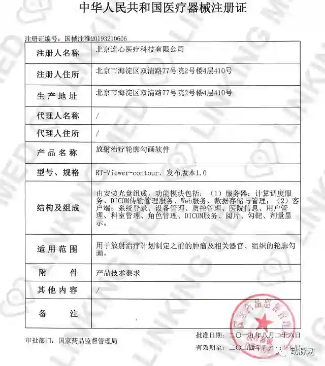连心医疗此次获得三类医疗器械认证的产品名称是“放射治疗轮廓勾画软件”。从注册证上看,该产品主要用于放射计划制定之前的肿瘤及相关器官、组织的轮廓勾画。