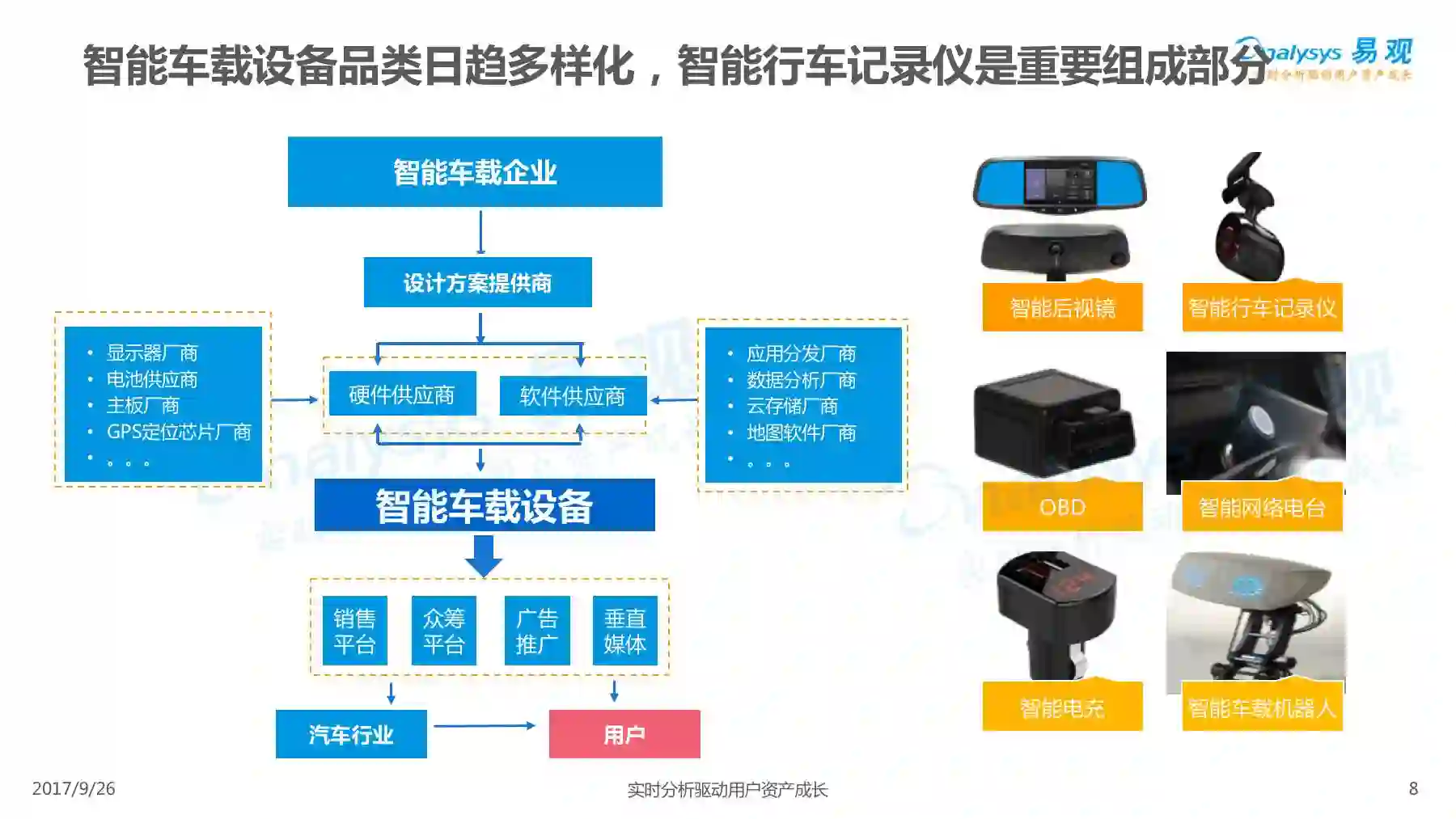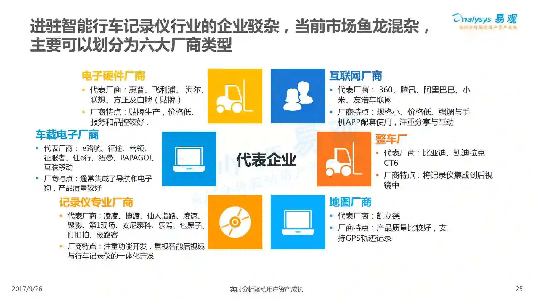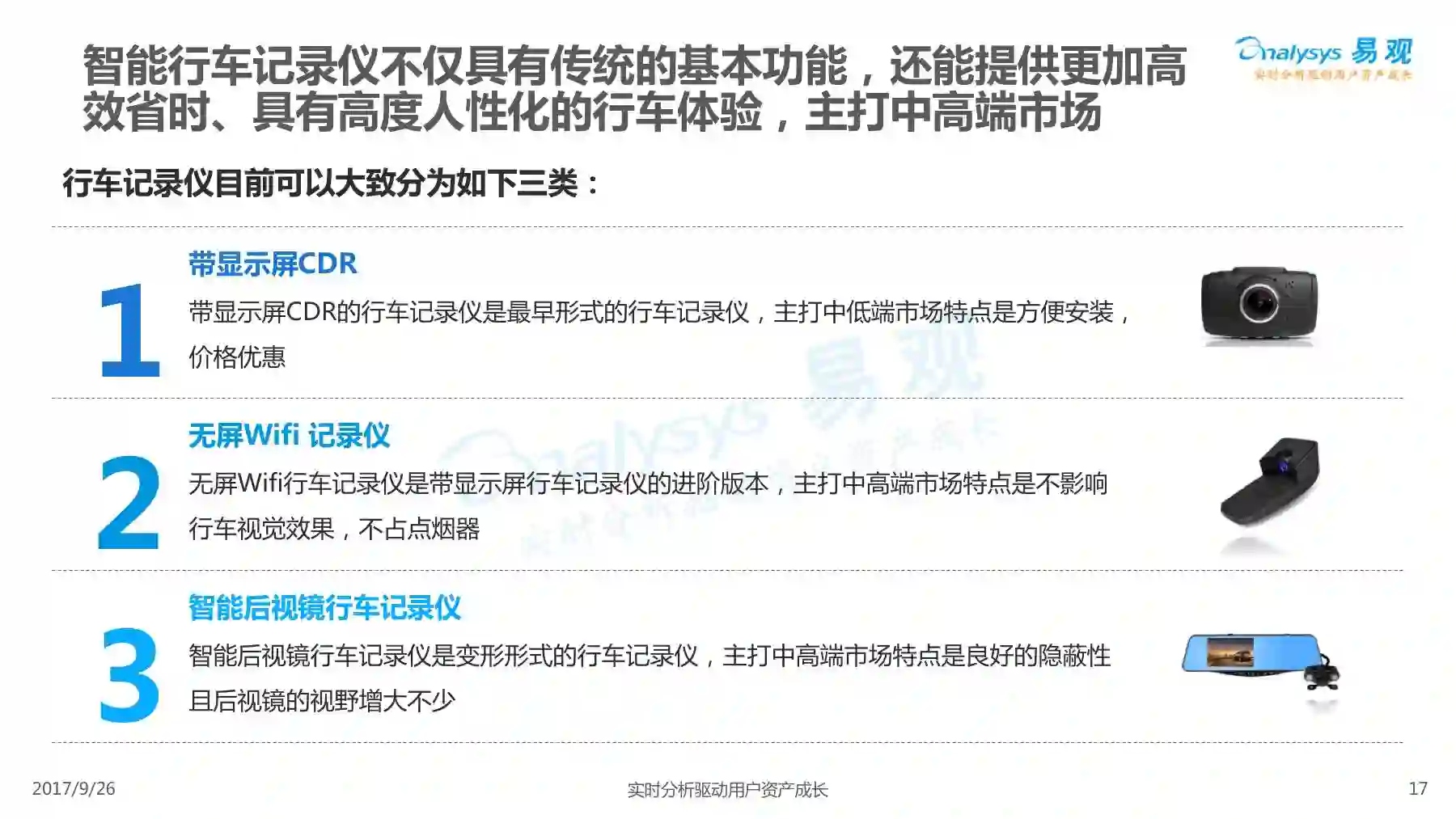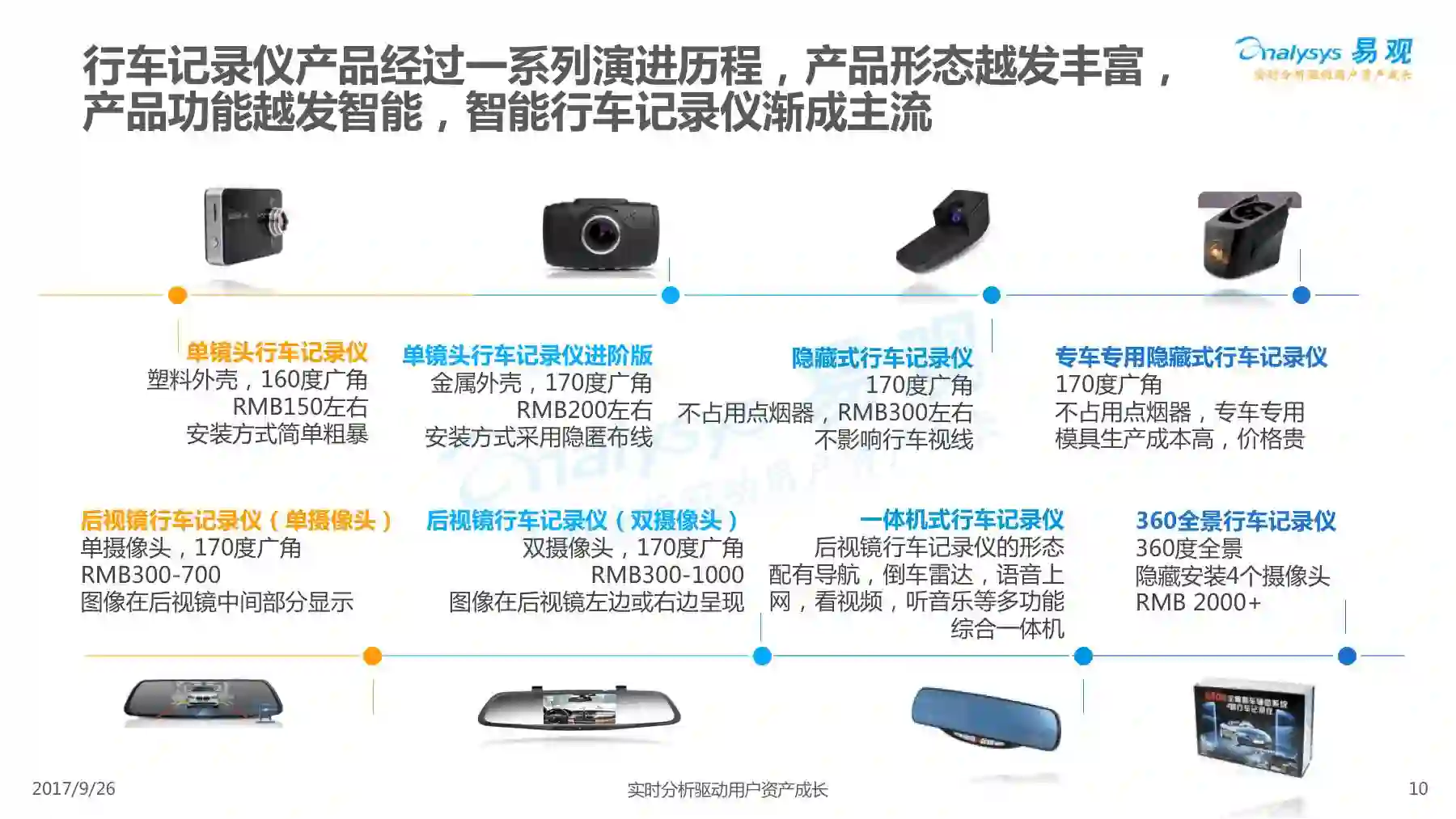 行车记录仪产品经过一系列演进历程,产品形态越发丰富,产品功能越发智能,智能行车记录仪渐成主流,线上渠道是智能行车记录仪的主要销售渠道,进驻智能行车记录仪行业的企业驳杂,当前市场鱼龙混杂,主要可以划分为六大厂商类型。 本次分析主要针对中国智能行车记录仪市场进行分析,涉及到智能行车记录仪、人工智能、车联网等多个方面。