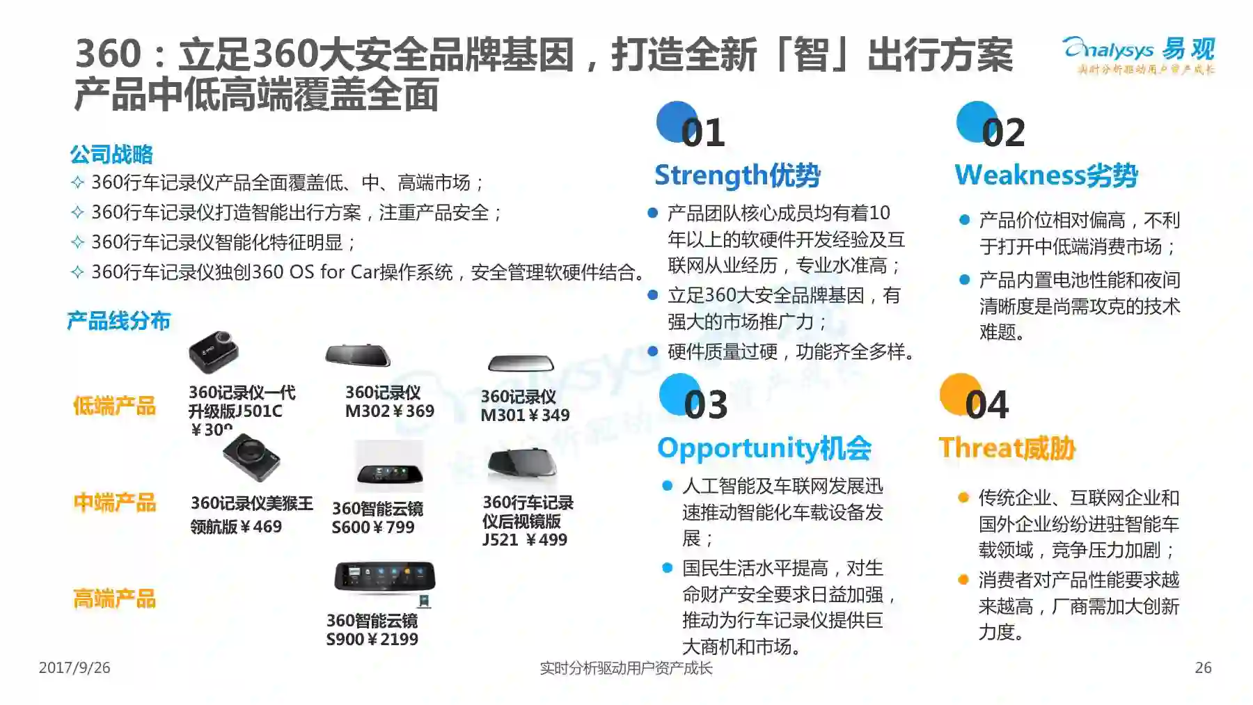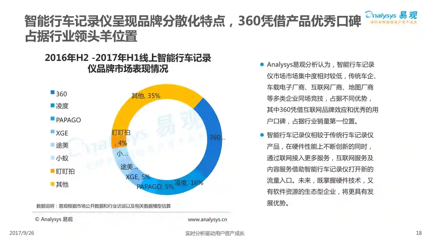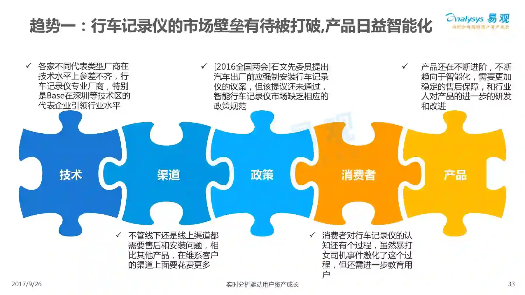 行车记录仪产品经过一系列演进历程,产品形态越发丰富,产品功能越发智能,智能行车记录仪渐成主流,线上渠道是智能行车记录仪的主要销售渠道,进驻智能行车记录仪行业的企业驳杂,当前市场鱼龙混杂,主要可以划分为六大厂商类型。 本次分析主要针对中国智能行车记录仪市场进行分析,涉及到智能行车记录仪、人工智能、车联网等多个方面。