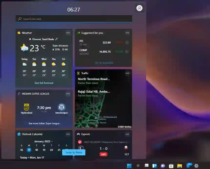 此外,微软还对文件资源管理器的侧边栏和全屏小组件进行了全新的设计。具体来讲,在 Windows 11 的任务栏界面中,提供了一个名为“小组件”的新功能,用户可以借此打开左侧的侧边栏,并显示诸如天气、Microsofe 新闻、交通以及体育赛事等信息。