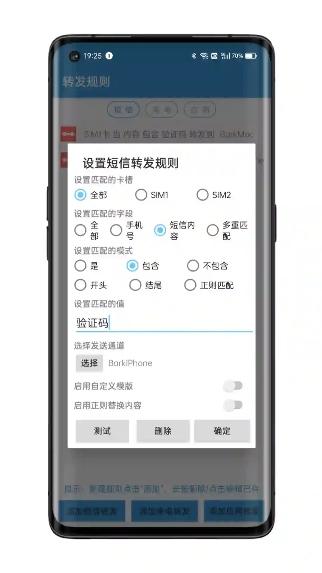 返回 App 首页,点击「转发规则 - 添加短信转发」,设置好你自己的短信转发规则。比如:当你只想转发备用机的验证码短信时,可以将短信内容匹配关键字设置为「验证码」,这样只有包含验证码的短信才会被转发,其他诸如广告营销、公益宣传等内容的短信则不会被转发。此处也可以根据自己的需要添加其他规则。