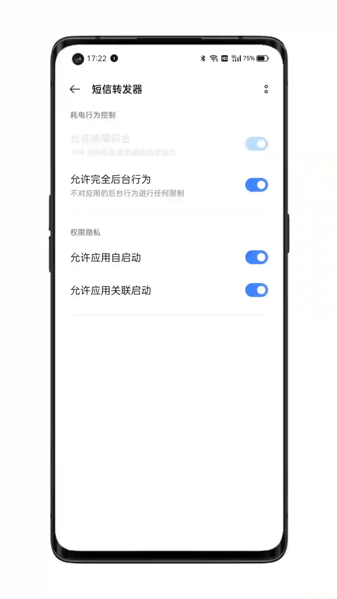 出于续航因素考虑,Android 手机的后台策略都非常保守,致使 SmsForwarder 在后台运行时,容易被系统 kill 软件后台进程。为保证短信转发功能的正常运作,需要在手机系统中设置好 App 的自启动、后台运行、电池优化等必要权限。由于各品牌手机的设置方式存在差异,在此不做详细说明。