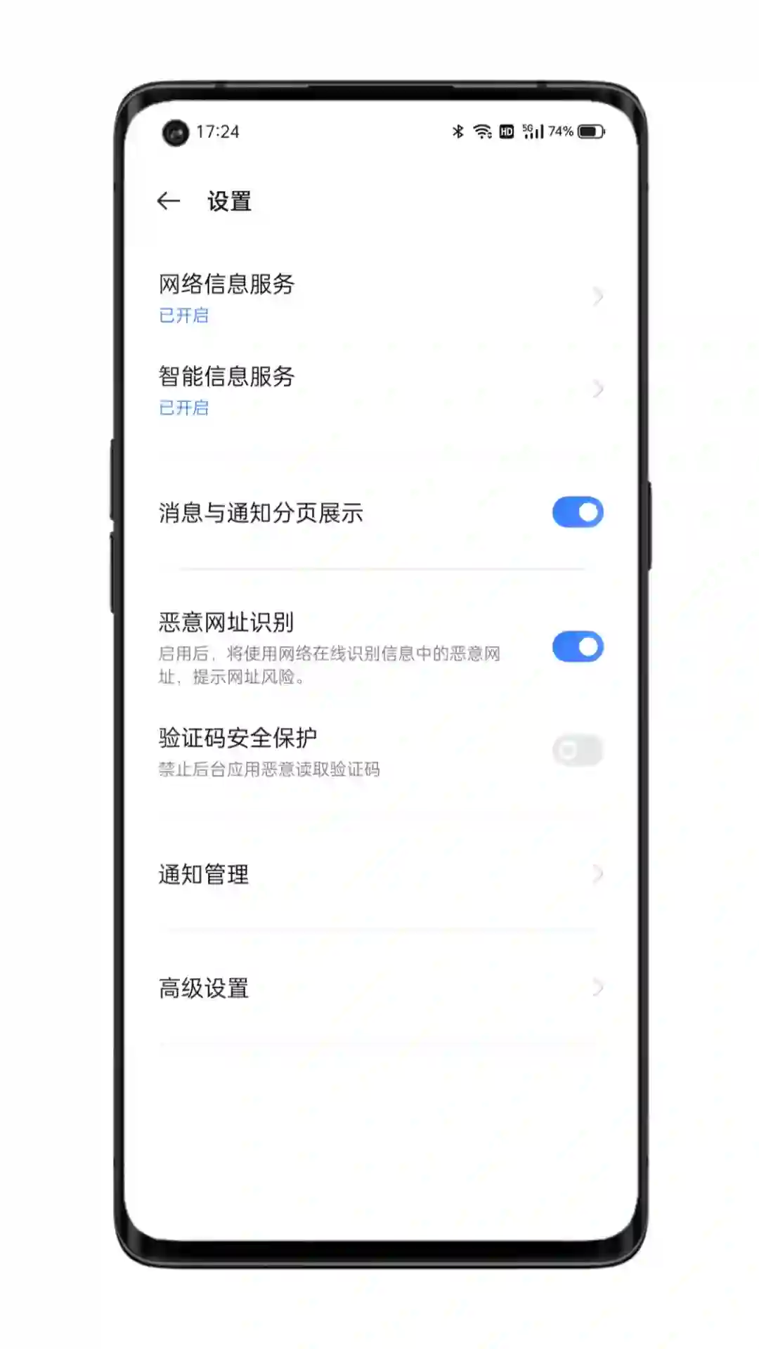 出于隐私角度考虑,一些国内的定制系统会默认隐藏包含验证码的短信,第三方应用即使被授予短信权限,也无法读取到这类型的短信。因此需要在手机短信设置中关闭相关防护功能,此类短信才能被读取并转发至其他设备。