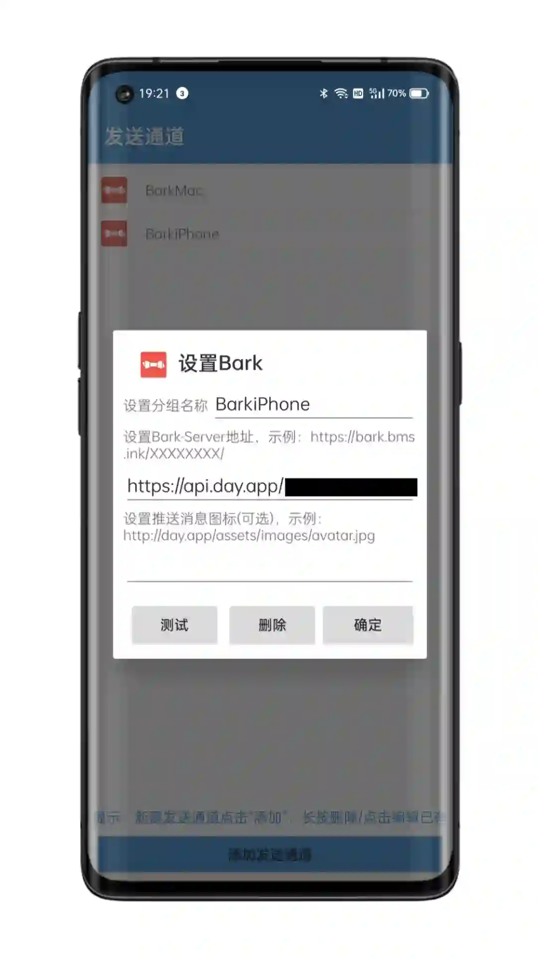 第一次打开 Bark App 时,会自动为你的设备生成 key ,复制 App 首页自动生成的第一个带有 key 参数的 URL 备用。