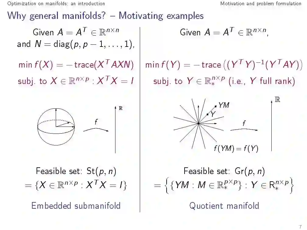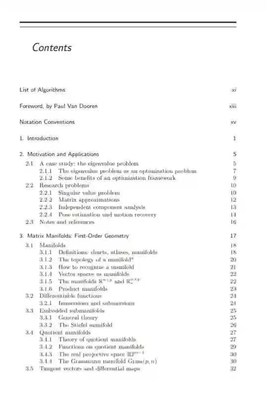 科学和工程中的许多问题都可以换种说法,即具有流形结构的矩阵搜索空间的优化问题。这本书展示了如何利用这些问题的特殊结构来开发有效的数值算法。它把重点放在了算法的数值公式和它的微分几何抽象上——说明好的算法是如何从微分几何、优化和数值分析的洞察力中同等地得出的。另外两个理论章节为读者提供了算法发展所必需的微分几何背景。在其他章节中,几个著名的优化方法,如最速下降法和共轭梯度法被推广到抽象流形。这本书提供了这些方法中的每一个的一般发展,建立在几何章节的材料上。然后,它指导读者通过计算,把这些几何公式的方法变成具体的数值算法。在数值线性代数中特征空间问题的选择问题中,所给出的最先进的算法与现有的最佳算法是有竞争力的。