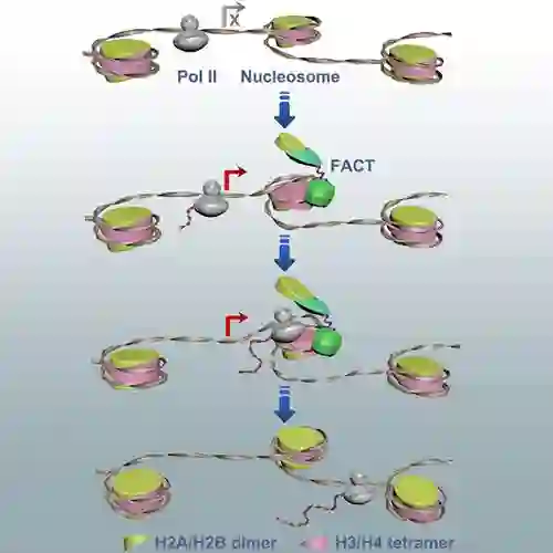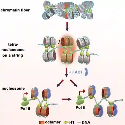 图2 FACT对染色质纤维的负调控。FACT的结合让染色质纤维非常容易打开到核小体链的状态,便于转录机器PolII的结合,为基因转录做好准备。