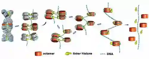 图1 染色质纤维动态折叠路径,四聚核小体单元是折叠路径中稳定的中间态。