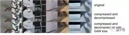 顶层是ImageNet数据集里的图,中间那层是传统损失训练出来的图像压缩神经网络压缩和解压后的效果,底层是GAN损失和传统损失一起训练的神经网络效果。可以看得出来,底层的图边缘更锐利,细节更丰富,虽然和原图还是有一定的差距。