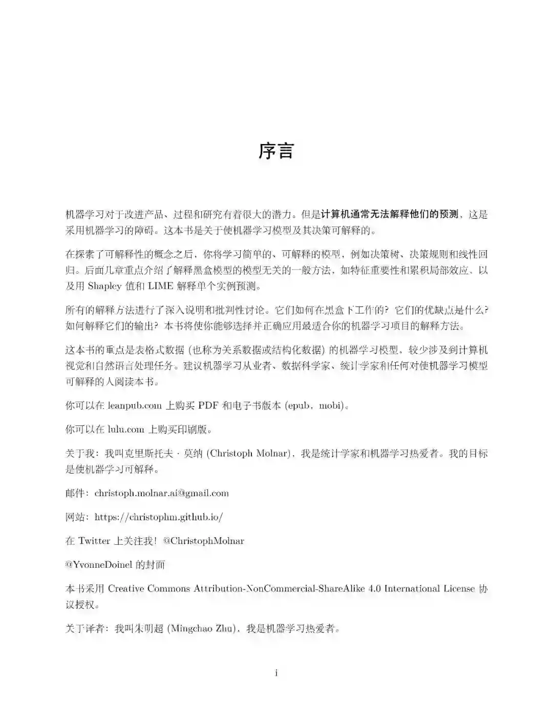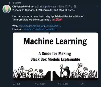 这本书由复旦大学朱明超完成它的翻译和校正工作,目前已经开源放到GitHub网页上,《可解释的机器学习》。作者Christoph Molnar 在其后也发到了推特上。