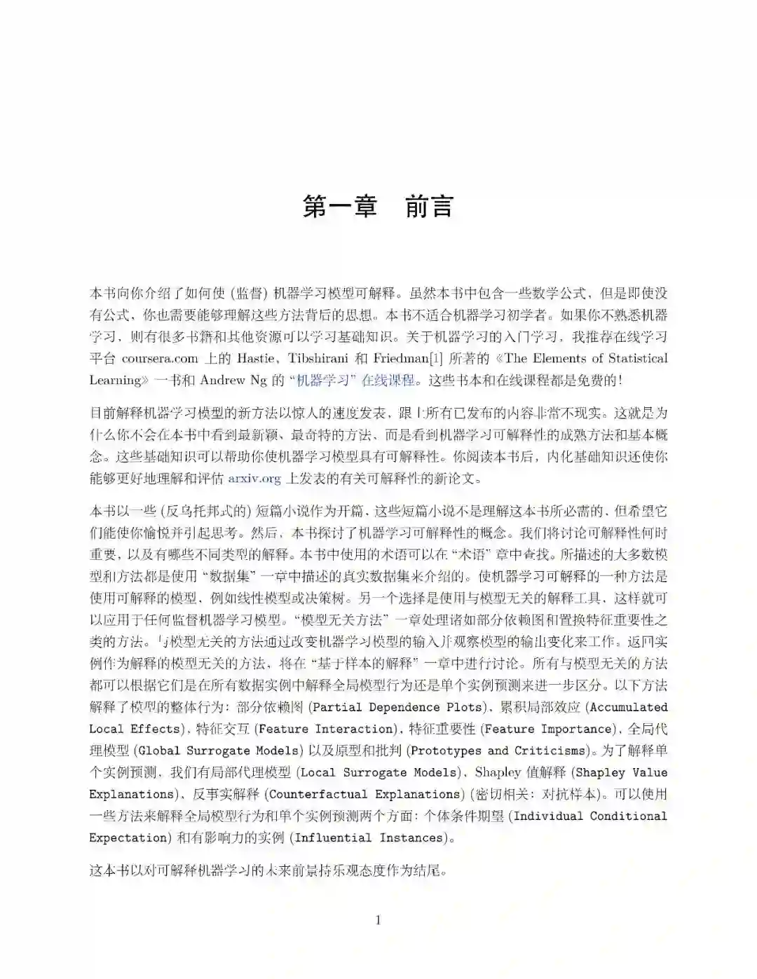 这本书的重点是机器学习的可解释性。你将学习简单的、可解释的模型,如线性回归、决策树和决策规则等。后面几章重点介绍了解释黑盒模型的模型无关的一般方法,如特征重要性和累积局部效应,以及用 Shapley 值和 LIME 解释单个实例预测。