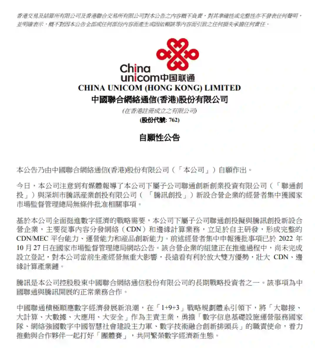 据国家市场监管总局官网近期发布的《2022年10月17日-10月23日无条件批准经营者集中案件列表》显示,联通创新创业投资有限公司与深圳市腾讯产业创投有限公司新设合营企业案获无条件批准。中国联通回应称,该合营企业的组建正在推进过程中,长远看有利于放大双方优势,壮大CDN、边缘计算产业链。据悉,2018年2月起,腾讯集团高级执行副总裁卢山已同时担任中国联合网络通信股份有限公司董事职务。(中新财经、北京日报)