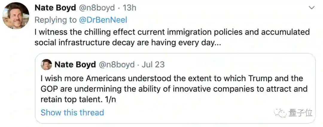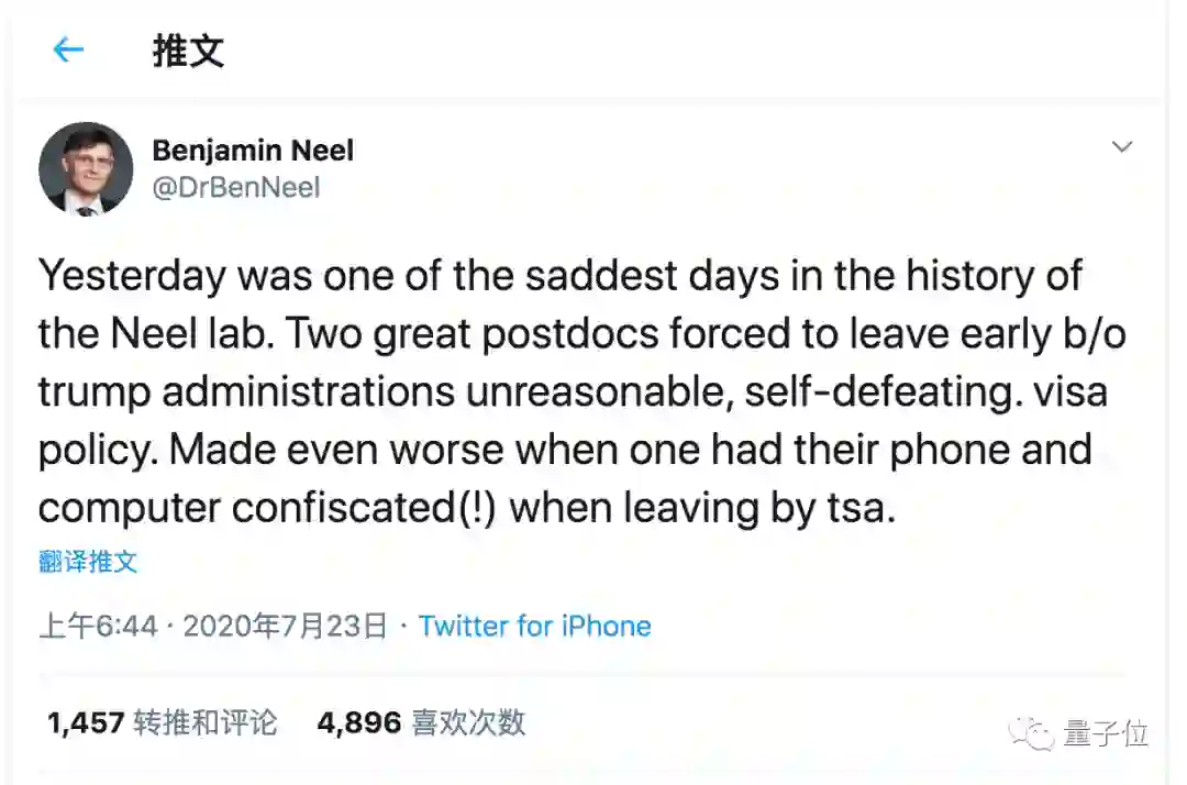 纽约大学尼尔实验室的负责人、医学家本杰明·尼尔(Benjamin Neel)在推特上愤怒的爆料,他创立的实验室里,两名来自中国的博士后,因川普的签证政策被迫离开。
