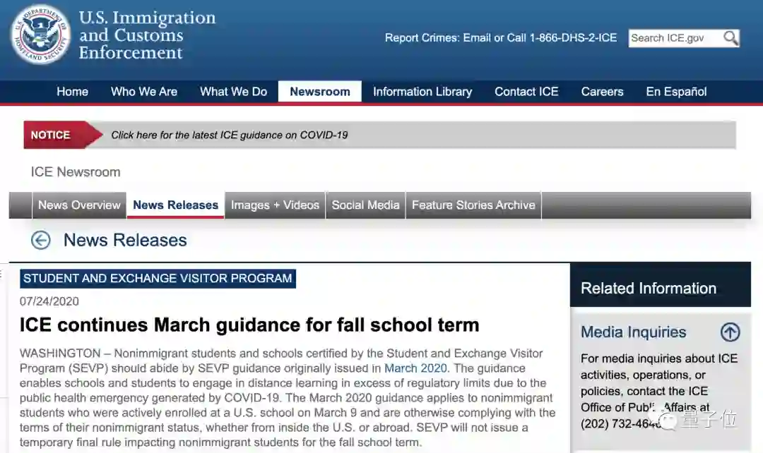 此前,美国移民和海关执法局(ICE)曾发布政策,如果美国高校留学生无法参加2020年秋季线下课程,只上网课,那么就将失去留学签证并被驱逐出境。