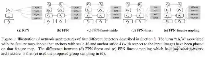 3 FPN-finest-stride:与FPN类似,但所有尺度anchor都只作用于P2上,anchor尺度 = {16,32,64,128},对应stride = {4,8,16,32};---- This is implemented by sub-sampling P2 for larger strides,还多了这么一句话,费解;进一步上采样P2?