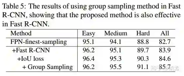table 5使用FPN-finest-sampling为baseline,可以发现使用Fast R-CNN后性能有所提升,group sampling进一步提升模型性能,并在wider face hard上取得sota,充分说明二者可以完美结合;