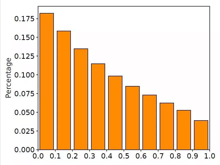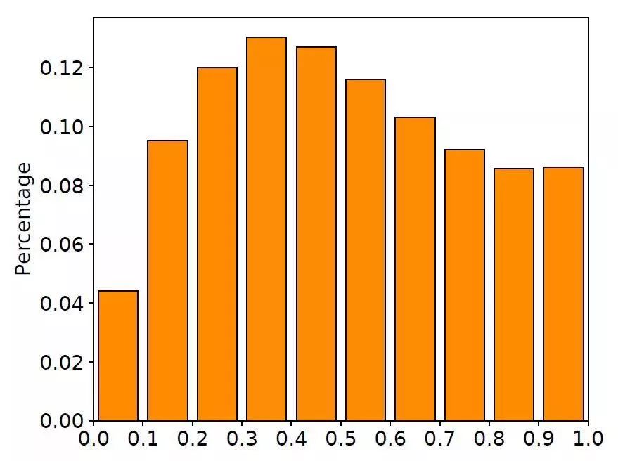 除了比较数值实验结果外,我们进一步地观察了模型中门的取值,用同样的语料画出了我们的模型中门的取值分布直方图,如下图所示。