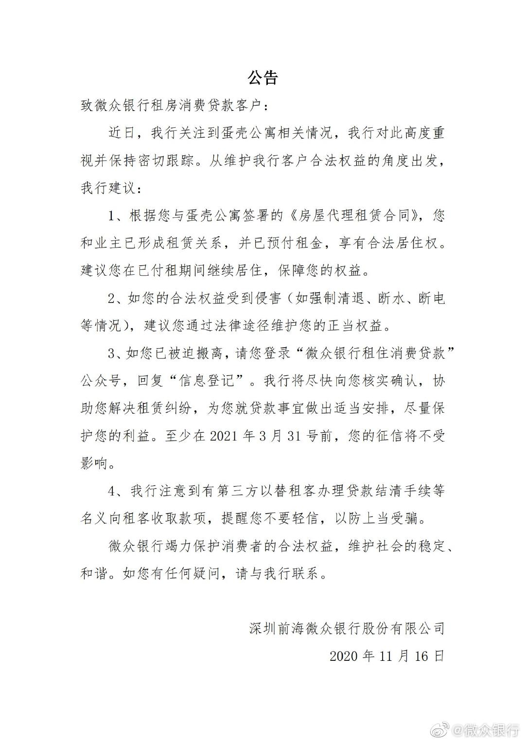 近日,对于蛋壳公寓近日爆出经营困局,与蛋壳合作“租金贷”业务的微众银行表示,建议客户再已付期间继续居住,保障合法权益。如果客户合法权益收到侵害(如强制清退、断水、断电等情况),建议通过法律途径维护正当权益。如客户已被迫搬离,该行将做出适当安排,尽量保护客户权益,至少在2021年3月31日前,征信将不受影响。(21财经)