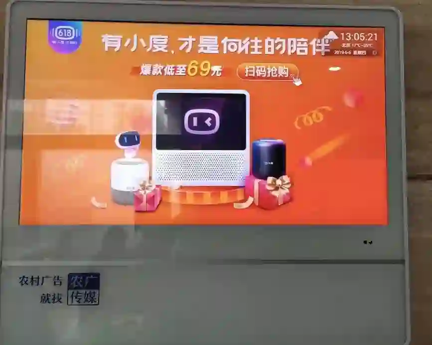 新入驻的电子广告屏幕是一家叫农广传媒的创业公司投放的。这块22寸的屏上,一共有12个广告位,每个广告位的播放时间是15秒,其中部分广告位被花生好车、BOSS直聘、福田汽车等全国性品牌占据,剩下的被本地相亲交友平台、教育培训机构占据。近来,随着618战事打响,淘宝、苏宁、京东这样的电商平台也纷纷入驻。