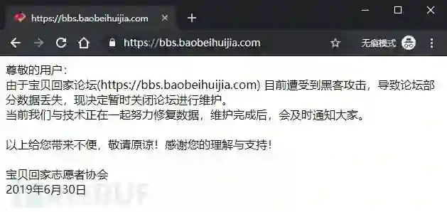 2019年6月30日,一个名为“宝贝回家”的民间志愿者寻子公益网站的官方论坛(https://bbs.baobeihuijia.com)无法正常访问。官方公告称,遭受黑客攻击导致部分数据丢失,目前仍然在闭站维护中。