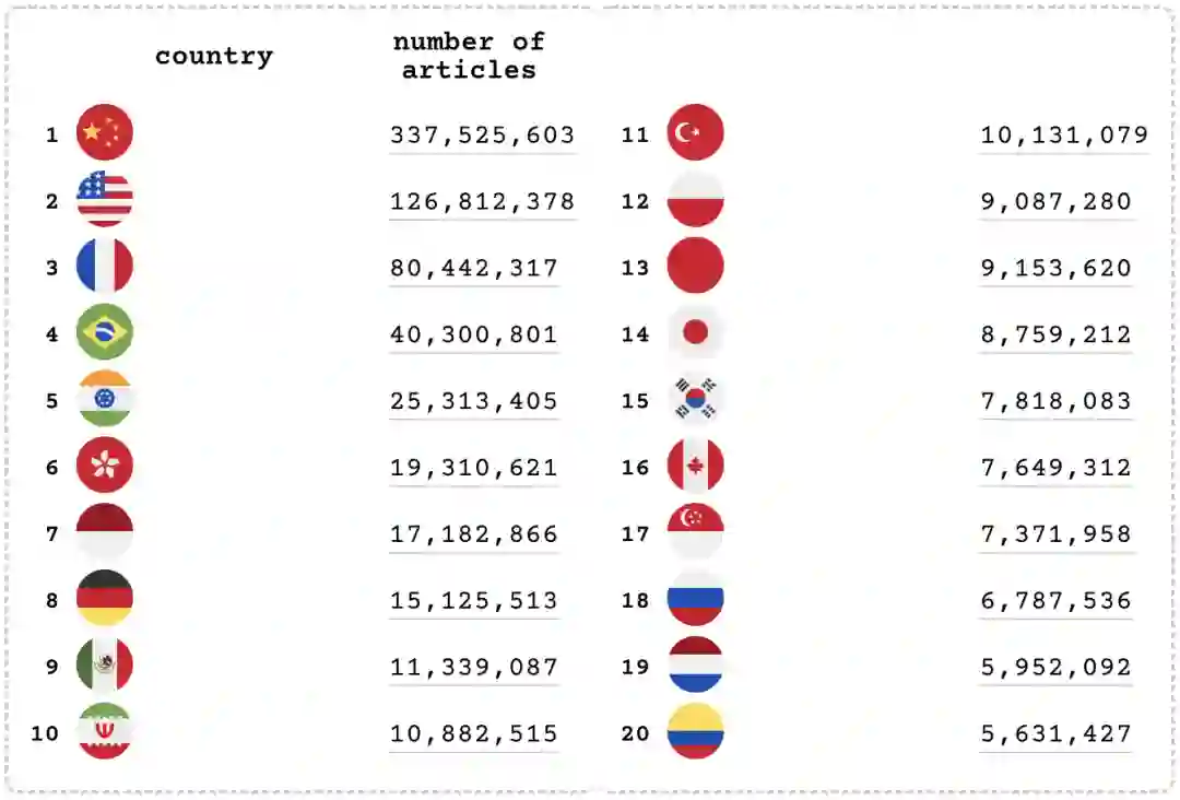 此次更新放出了一张用户数据的示例:即上个月从Sci-Hub下载论文最多的国家或地区排行(按下载次数大小排序)。