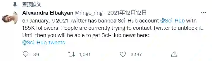 受到印度诉讼案的影响,2021年1月,推特官方宣布永久封禁Sci-Hub账号,理由是「违反平台有关假冒产品的政策」。被封禁时,该账号粉丝数量超过18.5万。
