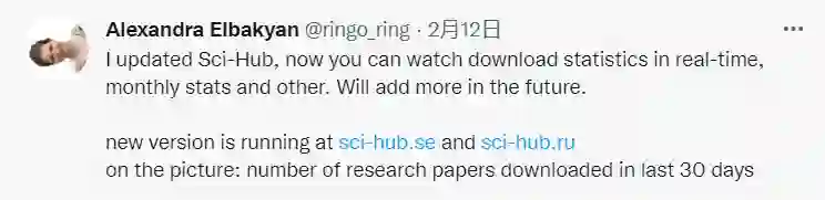 最近,Sci-Hub创始人Alexandra Elbakyan发布推文称自己更新了Sci-Hub,用户现在可以查看实时下载数据、月度下载数据等等。