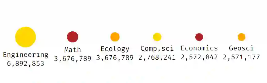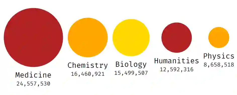 在涵盖论文的学科分布上,Sci-Hub数据库中的大多数研究文章(约 2500 万篇)来自医学和健康方面的期刊,接下来是化学、生物学、人文社会科学、物理学等领域。