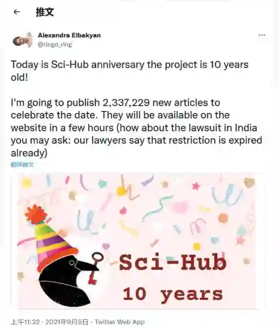 推文中写道:「今天是Sci-Hub的周年纪念日,这个项目已经成立 10 年了!我将发表2,337,229篇新文章来庆祝这个日子」