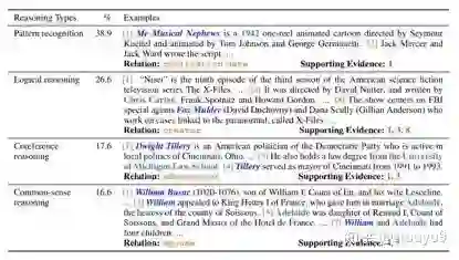 为了推动文档级关系抽取的研究,课题组姚远同学等 [30] 提出了DocRED数据集,是一个大规模的人工标注的文档级关系抽取数据集,基于维基百科正文和WikiData知识图谱构建而成,包含5,053篇维基百科文档,132,375 个实体和53,554 个实体关系事实,是现有最大的人工标注的文档级关系抽取数据集。如下图所示,文档级关系抽取任务要求模型具有强大的模式识别、逻辑推理、指代推理和常识推理能力,这些方面都亟待更多长期的研究探索。