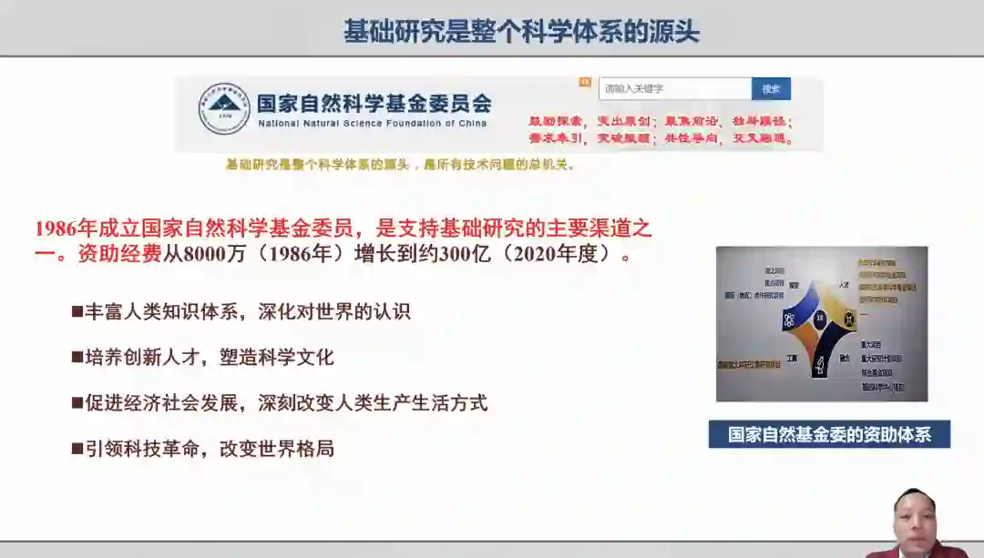 (1)科学基金资助的基本格局。包括研究项目系列(以培育创新思想为重点)、人才培养系列(以培育创新人才为重点)、科研环节条件系列(以优化基础研究发展环境为重点)。