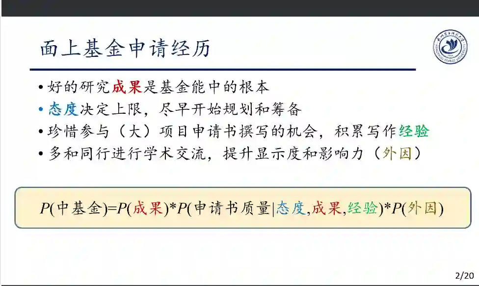 (1)面上基金申请经历。态度决定上限,尽早开始筹备;要多参与一些大项目申报,积累写作经验;多与同行进行学术交流。